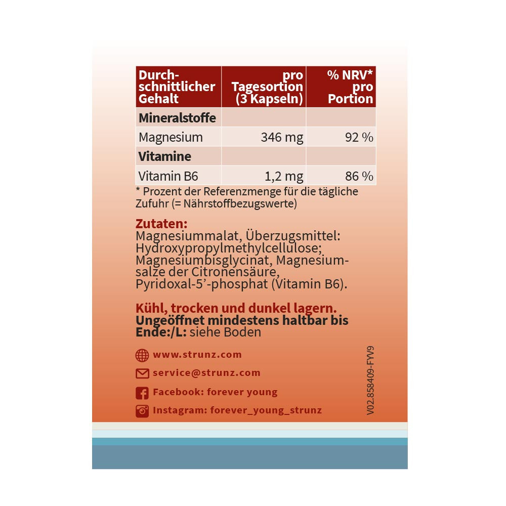 Pro Tagesportion (3 Kapseln) sind 346 mg elementares Magnesium enthalten, das sich aus drei hochpotenten Magnesiumarten (Magnesiummalat, Magnesiumbisglycinat, Magnesiumcitrat) zusammensetzt und die Magnesiumaufnahme so besonders einfach und bioverfügbar gestaltet. So werden die unterschiedlichen Magnesiumarten durch ihre Bindungspartner anders verstoffwechselt und versorgen den Körper optimal mit Magnesium, egal ob direkt ins Blut oder über das kontinuierliche Auffüllen der Magnesiumspeicher.