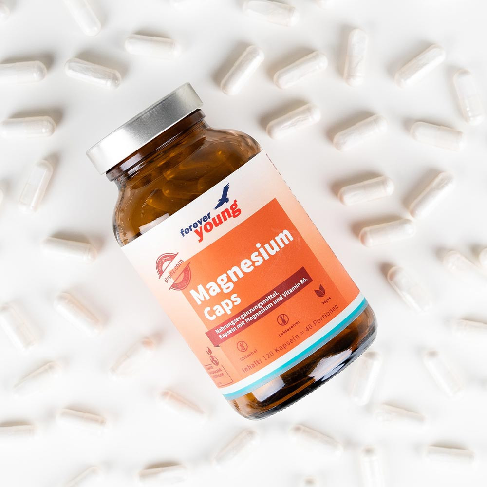 Magnesium Caps ist ein Nahrungsergänzungsmittel mit 3 verschiedenen Magnesiumarten, die sich gegenseitig ergänzen und aktiviertem Vitamin B6. Über den Tag verteilt eingenommen wird der Körper so stetig mit kleinen Mengen an Magnesium versorgt.