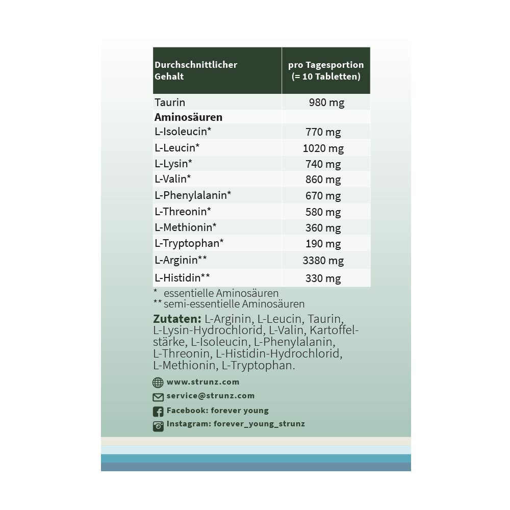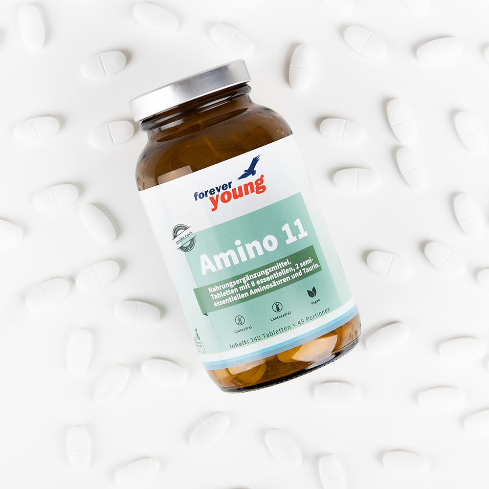 Amino 11 ist ein Nahrungsergänzungsmittel in Tablettenform und enthält 8 essentielle Aminosäuren, 2 semi-essentielle Aminosäuren (Histidin und Arginin) und Taurin in pflanzlicher, reiner, kristalliner Form.