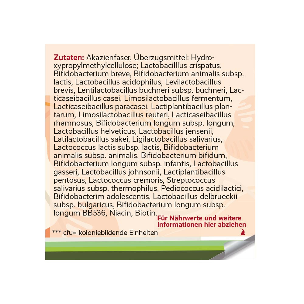 Akazienfaser, Überzugsmittel: Hydroxypropylmethylcellulose; Lactobacilllus crispatus, Bifidobacterium breve, Bifidobacterium animalis subsp. lactis, Lactobacillus acidophilus, Levilactobacillus brevis, Lentilactobacillus buchneri subsp. buchneri, Lacticaseibacillus casei, Limosilactobacillus fermentum, Lacticaseibacillus paracasei, Lactiplantibacillus plantarum, Limosilactobacillus reuteri, Lacticaseibacillus rhamnosus, Bifidobacterium longum subsp. longum, Lactobacillus helveticus, Lactobacillus jensenii, Latilactobacillus sakei, Ligilactobacillus salivarius, Lactococcus lactis subsp. lactis, Bifidobacterium animalis subsp. animalis, Bifidobacterium bifidum, Bifidobacterium longum subsp. infantis, Lactobacillus gasseri, Lactobacillus johnsonii, Lactiplantibacillus pentosus, Lactococcus cremoris, Streptococcus salivarius subsp. thermophilus, Pediococcus acidilactici,