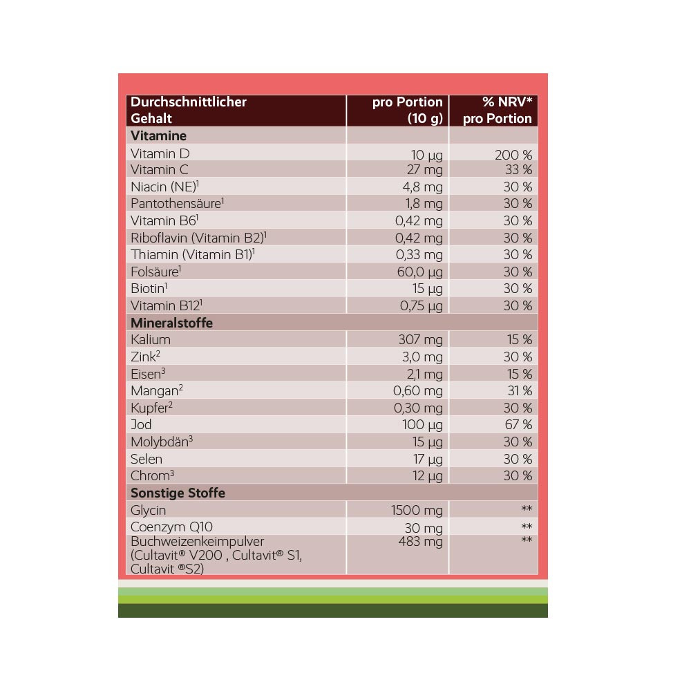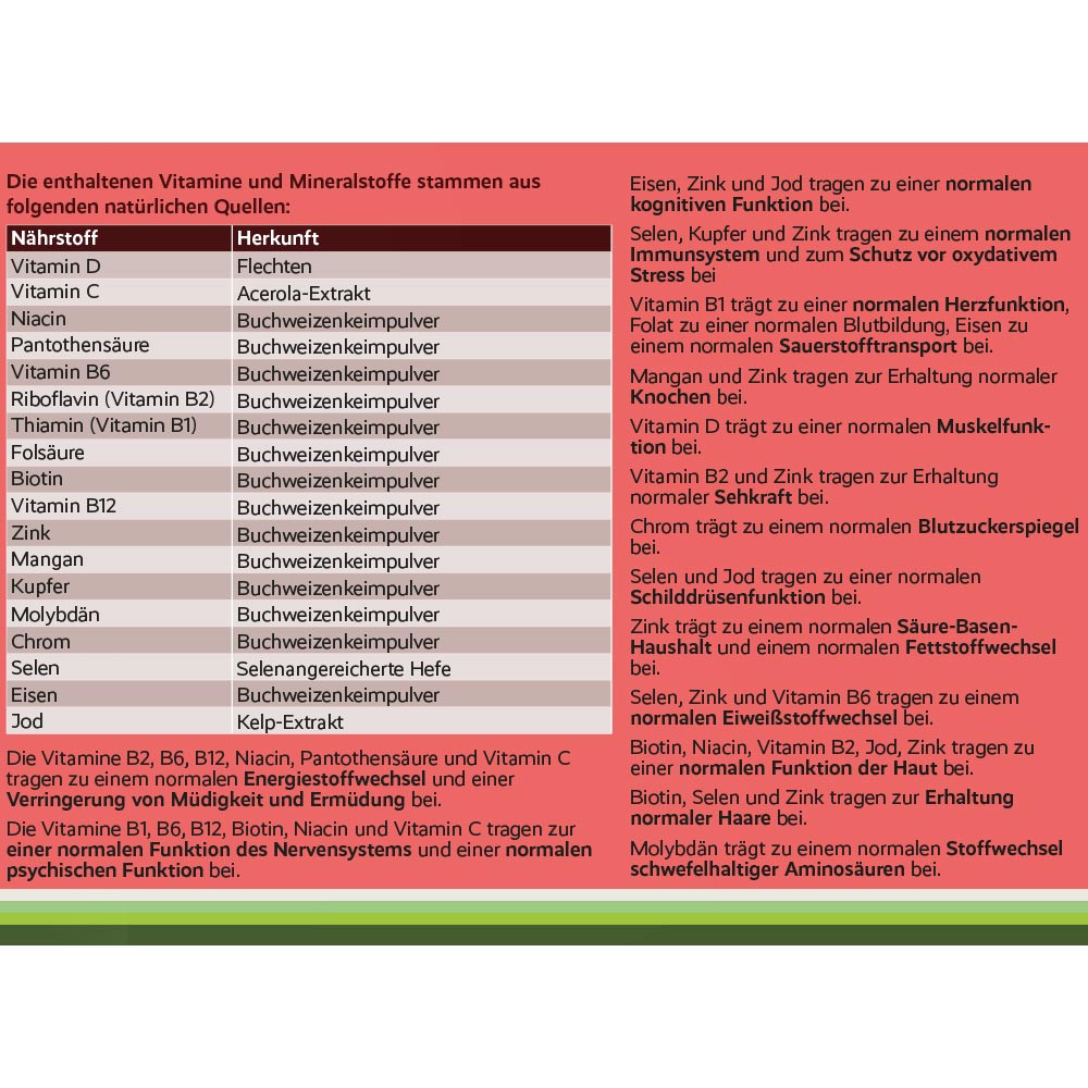 - Vitamine und Mineralstoffe - aus Buchweizenkeimen, Kelp und Acerola – darunter Vitamin C, Vitamin D, Eisen, Zink, Selen, Folsäure, Jod und B-Vitamine.