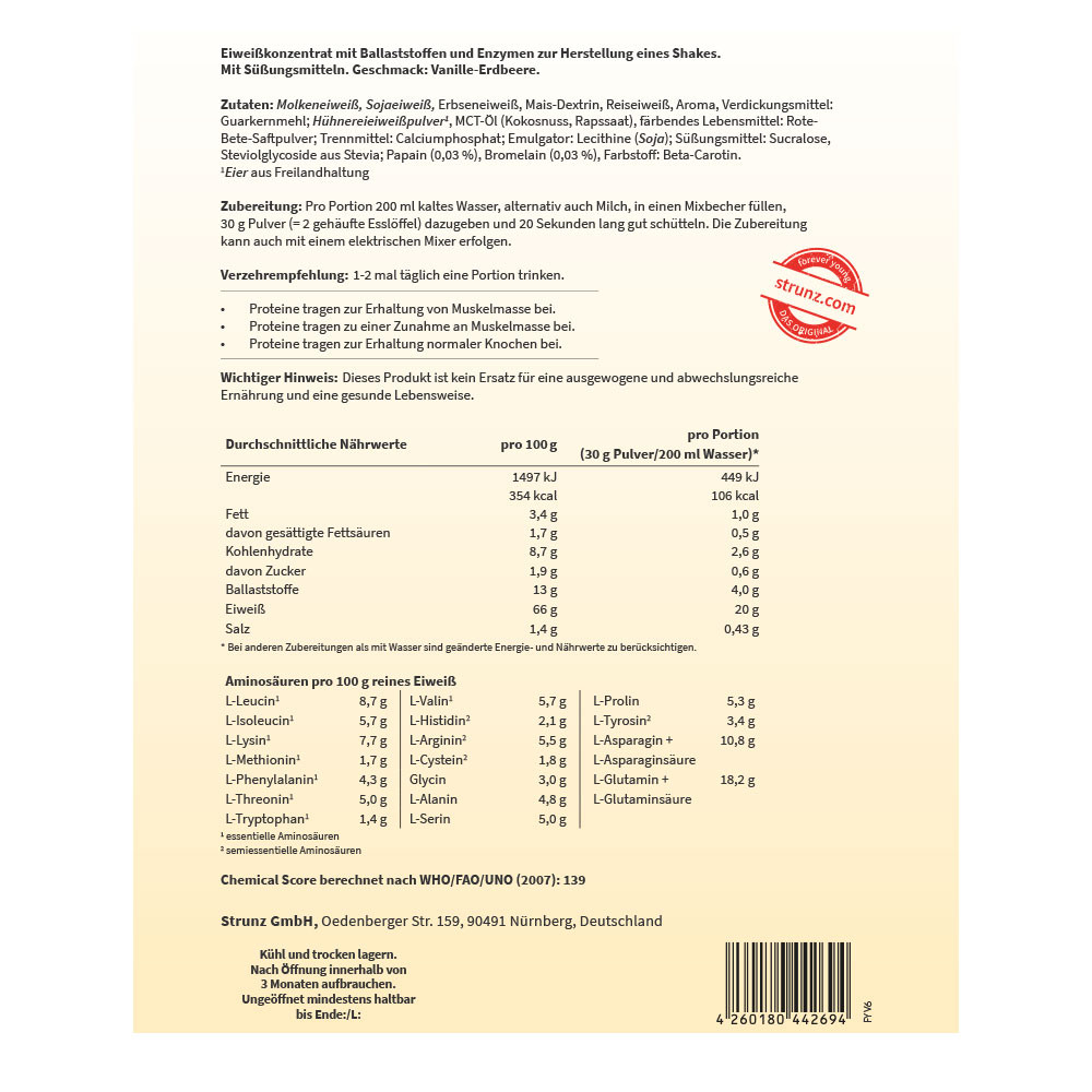 Molkeneiweiß, Sojaeiweiß, Erbseneiweiß, Mais-Dextrin, Reiseiweiß, Aroma, Verdickungsmittel: Guarkernmehl; Hühnereieiweißpulver1, MCT-Öl (Kokosnuss, Rapssaat), färbendes Lebensmittel: Rote-Bete-Saftpulver; Trennmittel: Calciumphosphat; Emulgator: Lecithine (Soja); Süßungsmittel: Sucralose, Steviolglycoside aus Stevia; Papain (0,03 %), Bromelain (0,03 %), Farbstoff: Beta-Carotin.