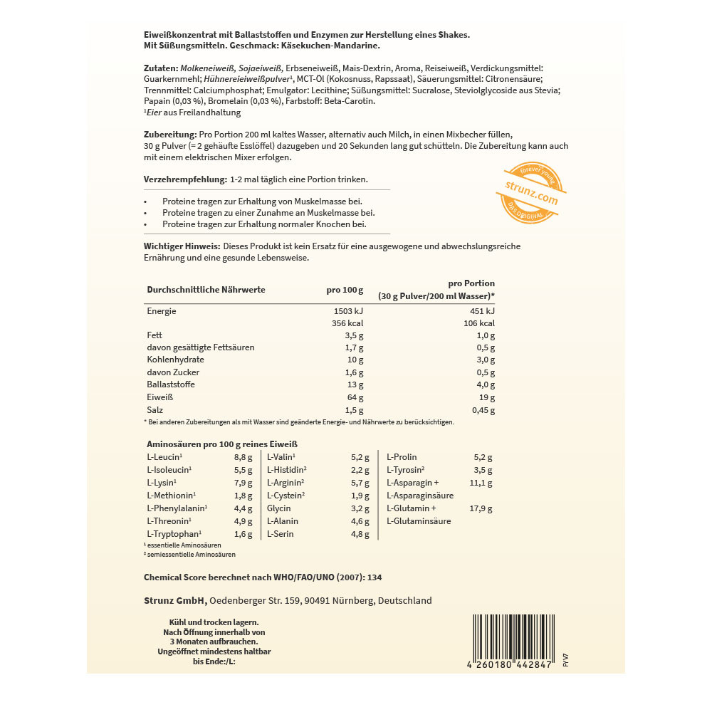 Molkeneiweiß, Sojaeiweiß, Erbseneiweiß, Mais-Dextrin, Aroma, Reiseiweiß, Verdickungsmittel: Guarkernmehl; Hühnereieiweißpulver1, MCT-Öl (Kokosnuss, Rapssaat), Säuerungsmittel: Citronensäure; Trennmittel: Calciumphosphat; Emulgator: Lecithine; Süßungsmittel: Sucralose, Steviolglycoside aus Stevia; Papain (0,03 %), Bromelain (0,03 %), Farbstoff: Beta-Carotin.