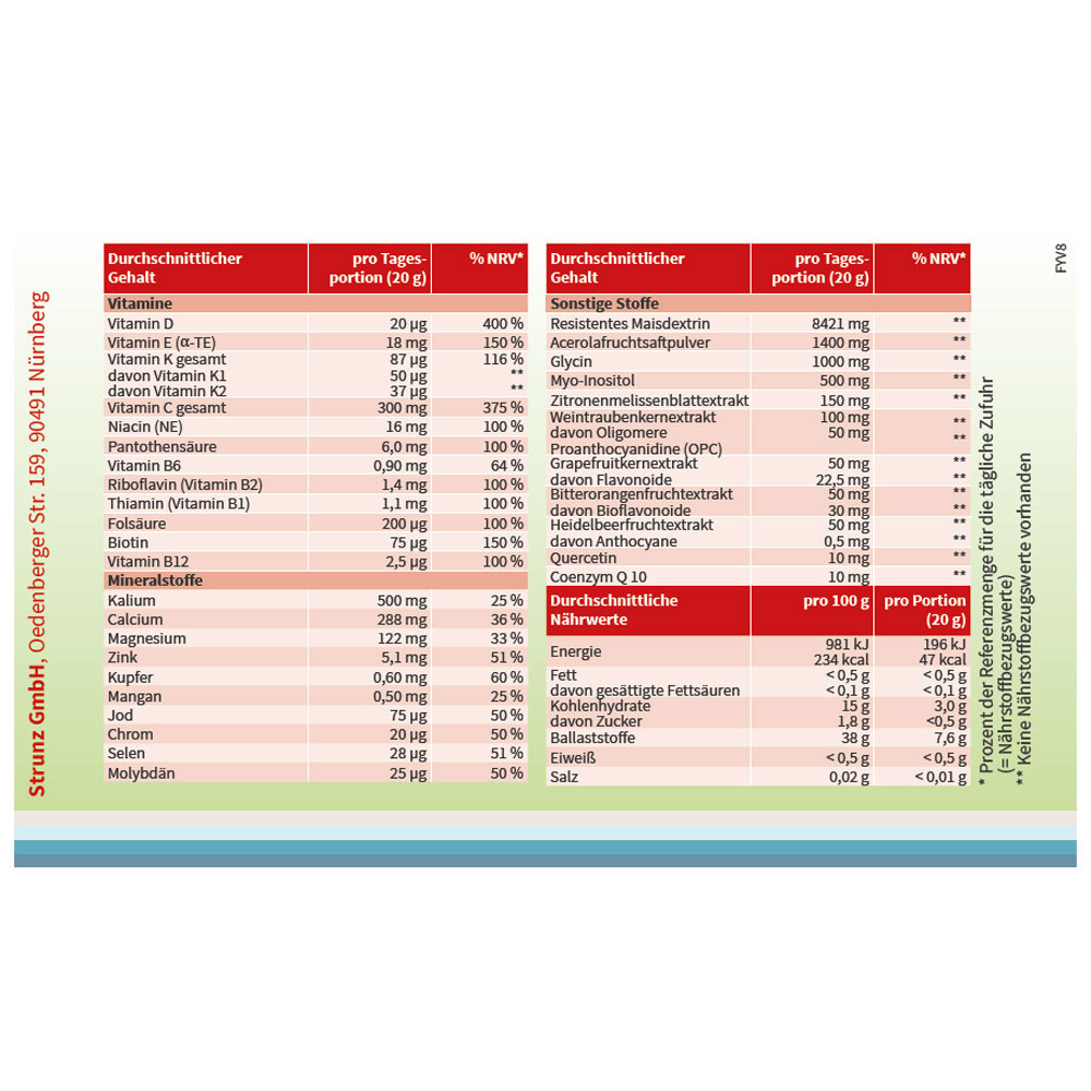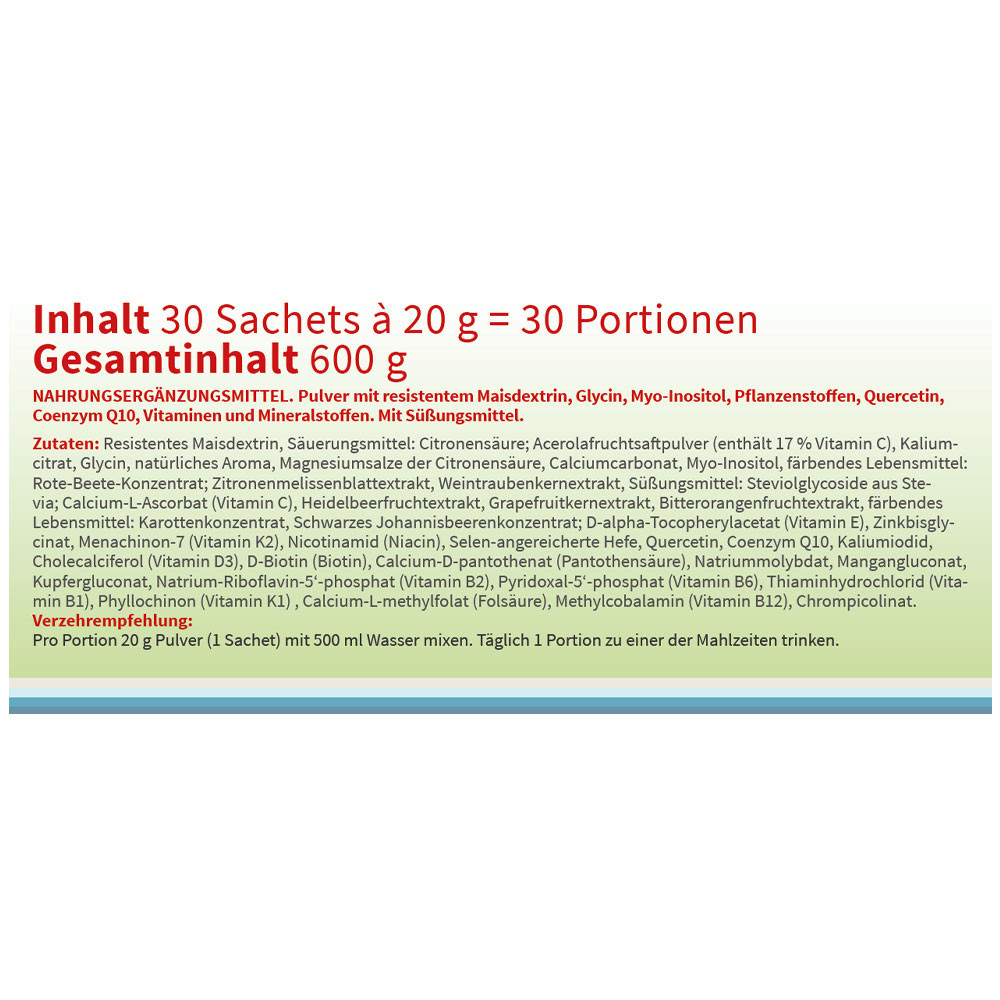 Resistentes Maisdextrin, Säuerungsmittel: Citronensäure; Acerolafruchtsaftpulver (enthält 17 % Vitamin C), Kaliumcitrat, Glycin, natürliches Aroma, Magnesiumsalze der Citronensäure, Calciumcarbonat, Myo-Inositol, färbendes Lebensmittel: Rote-Beete-Konzentrat; Zitronenmelissenblattextrakt, Weintraubenkernextrakt, Süßungsmittel: Steviolglycoside aus Stevia; Calcium-L-Ascorbat (Vitamin C), Heidelbeerfruchtextrakt, Grapefruitkernextrakt, Bitterorangenfruchtextrakt, färbendes Lebensmittel: Karottenkonzentrat, Schwarzes Johannisbeerenkonzentrat; D-alpha- Tocopherylacetat (Vitamin E), Zinkbisglycinat, Menachinon-7 (Vitamin K2), Nicotinamid (Niacin), Selen-angereicherte Hefe, Quercetin, Coenzym Q10, Kaliumiodid, Cholecalciferol (Vitamin D3), D-Biotin (Biotin), Calcium-D-pantothenat (Pantothensäure), Natriummolybdat, Mangangluconat, Kupfergluconat, Natrium-Riboflavin-5‘-phosphat (Vitamin B2), Pyridoxal-5‘-phosphat (Vitamin B6), Thiaminhydrochlorid (Vitamin B1), Phyllochinon (Vitamin K1) , Calcium-L-methylfolat (Folsäure), Methylcobalamin (Vitamin B12), Chrompicolinat.