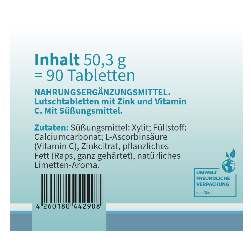 Süßungsmittel: Xylit; Füllstoff: Calciumcarbonat; L-Ascorbinsäure (Vitamin C), Zinkcitrat, pflanzliches Fett (Raps, ganz gehärtet), natürliches Limetten-Aroma.