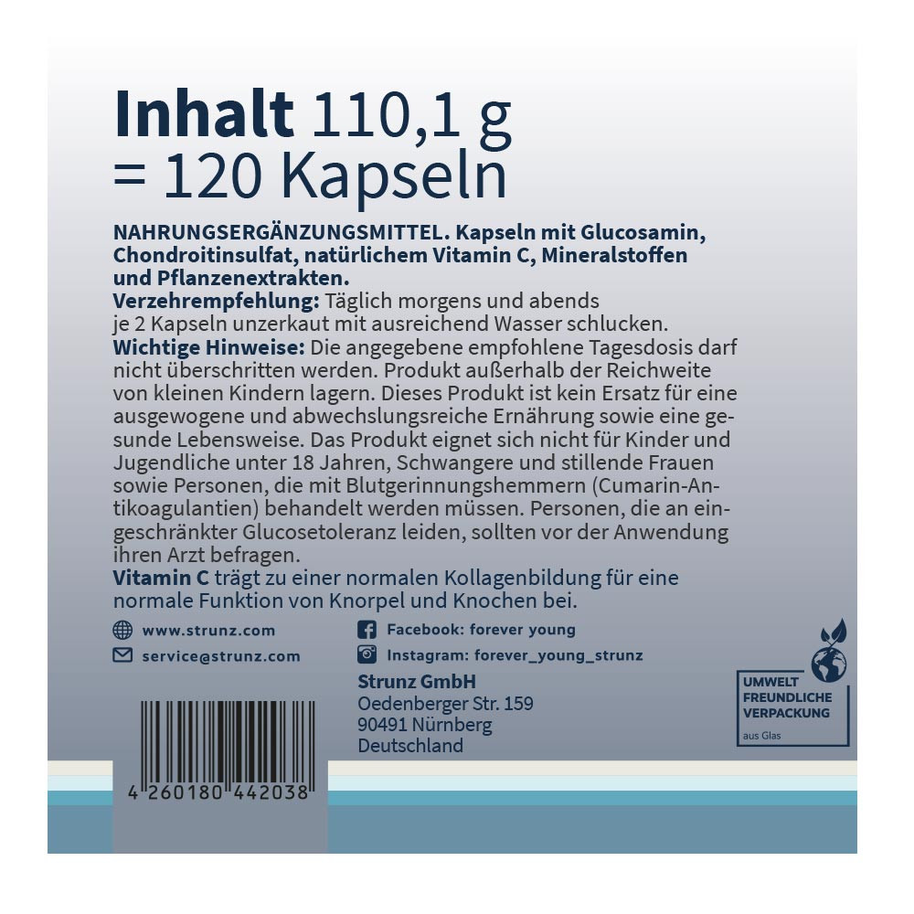 forever young Glucosamin + Chondroitin ist ein Nahrungsergänzungsmittel in Kapselform und enthält Glucosamin, Chondroitinsulfat, natürliches Vitamin C, Mineralstoffe und Pflanzenextrakte.