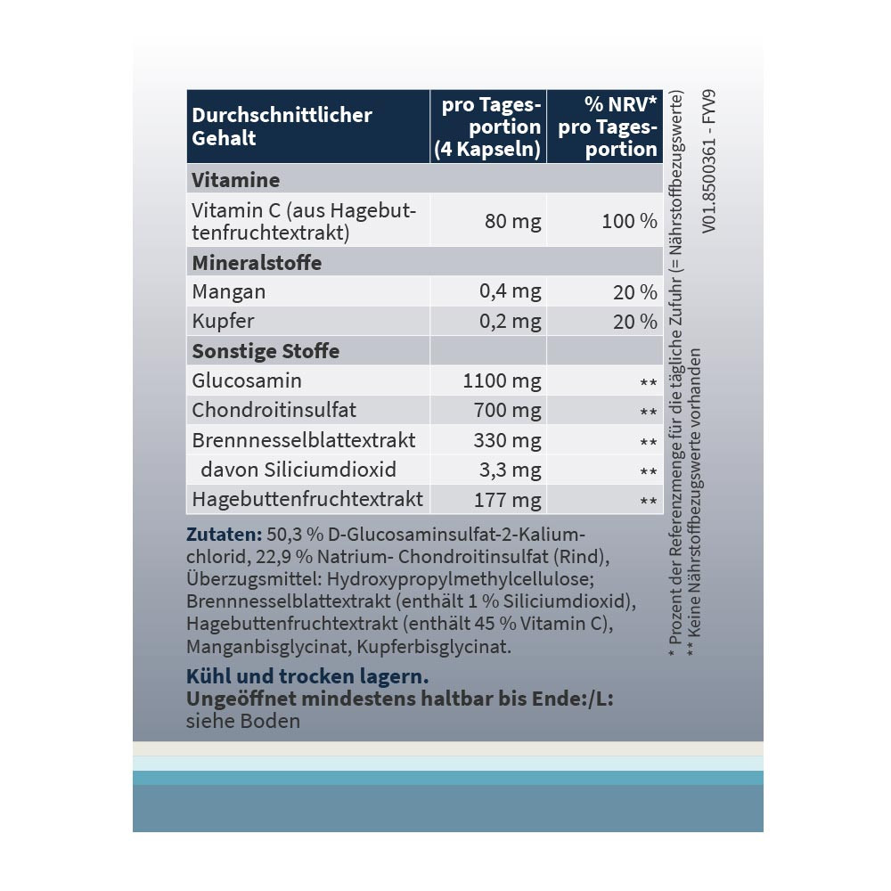 50,3 % D-Glucosaminsulfat-2-Kaliumchlorid, 22,9 % Natrium-Chondroitinsulfat (Rind), Überzugsmittel: Hydroxypropylmethylcellulose; Brennnesselblattextrakt (enthält 1 % Siliciumdioxid), Hagebuttenfruchtextrakt (enthält 45 % Vitamin C), Manganbisglycinat, Kupferbisglycinat.