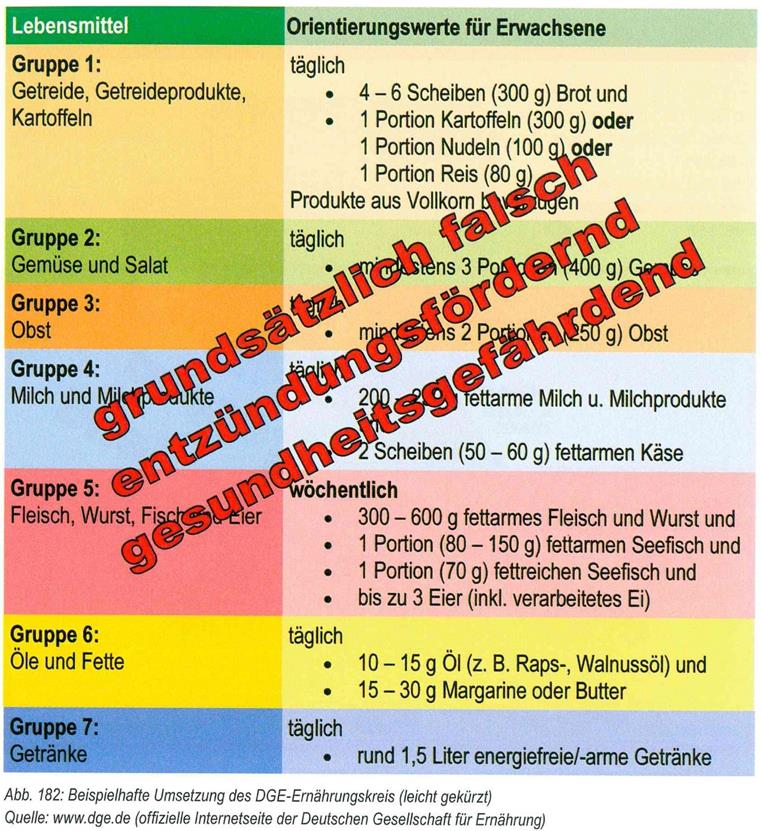 Und dann wird der Hauptfeind artgerechter, also gesunder, also genetisch korrekter Kost genannt: Die Deutsche Gesellschaft für Ernährung. Die DGE. Und das wird ausführlich, präzise und unwiderleglich begründet. So finden wir hier endlich einmal die Quelle. Die Quelle für die unmögliche Empfehlung der DGE, doch bitte 50 % oder mehr Kohlenhydrate zu sich zu nehmen. Ursprung unserer Zivilisationskrankheiten. Ein krankmachender Ratschlag. Ich zitiere einfach: