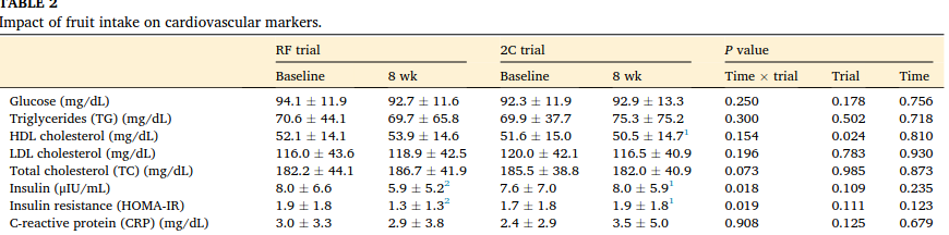 Doch HDL verbessert sich in der Gruppe, die Obst reduziert im Gegensatz zur Gruppe, die zwei Portionen Obst am Tag zu sich nimmt, denn dort fällt HDL leicht ab. Und die Auflösung kommt in der nächsten Zeile: Nüchterninsulin verbessert sich ziemlich stark in der Gruppe, die Obst (und somit Zucker) reduziert. Hingegen wird der Insulinwert bei der Gruppe, die zwei Portionen Obst am Tag isst, leicht schlechter. Zudem verschlechtert sich in der Obst-Gruppe auch der Wert für C-RP, denn der ist fast 50 Prozent höher. Und das nach nur 8 Wochen mit einer durchaus moderaten Menge an Obst (oder was wir heutzutage als Obst bezeichnen).