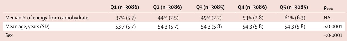 Hier in dieser „Studie“ hat man sage und schreibe ein 20 Prozent höheres Risiko berechnet und stellt dann Werte in der Grafik dar, die gar nicht ermittelt wurden. Man zitiert in dieser Studie auch eine weitere Studie und tut so, als würden sich auch dort die gleichen Ergebnisse wiederfinden. Doch als ich mir die Studie anschaue, stelle ich fest, dass auch hier die Gruppe, die sich angeblich „Low Carb“ ernährt hat, 37-42 Prozent Kohlenhydrate zu sich nimmt.