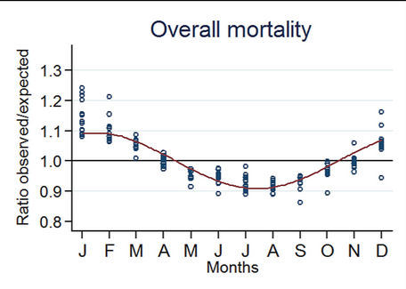 Seasonal Variation of Overall and Cardiovascular Mortality: A Study in 19 Countries from Different Geographic Locations, Pedro Marques-Vidal et al., 2014, DOI: 10.1371/journal.pone.0113500