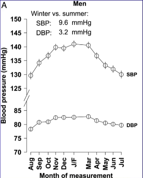 Hier hat Paul Mason einen spannenden Fund gemacht. Die UVA-Strahlung, die wir im Sommer auch bereits in den Morgen- und noch in den Abendstunden aufnehmen, führt dazu, dass wir vermehrt Stickstoffmonoxid-Synthese (NOS) durch die Haut ausführen und somit Stickstoffmonoxid bilden. Dieses Stickstoffmonoxid führt infolge dazu, dass sich Blutgefäße entspannen und der Blutdruck fällt. Um das zu beweisen, haben Forscher um Richard Weller insgesamt 24 Teilnehmer im Labor einer UVA-Strahlung für 20 Minuten ausgesetzt. Und siehe da, der Blutdruck fiel signifikant um 3,5 mm Hg. Das sieht man auch schon in der folgenden Darstellung, erneut über die Monate des Jahres: