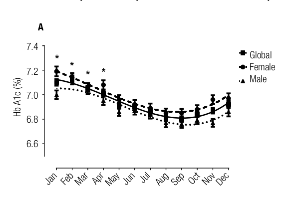 Und man fand noch einen spannenden Effekt, nämlich dass Stickstoffmonoxid die Insulinsensitivität beeinflusst und dadurch der HbA1c-Wert im Sommer ebenfalls niedriger liegt als im Winter, jedenfalls wurde dieser Effekt in Portugal festgestellt: