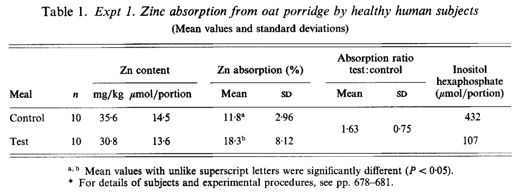 Quelle: Improved zinc and iron absorption from breakfast meals containing malted oats with reduced phytate content, Alminger Marie et al., 1996, DOI: 10.1079/BJN19960075